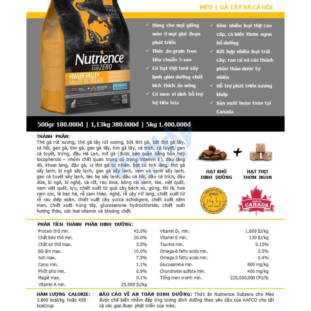 Sản phẩm Nutrience Subzero Fraser Valley cho Mèo sử dụng các nguồn nguyên liệu tự nhiên tươi sống của Canada như thịt gà tây, thịt gà cao cấp Canada, heo rừng, cá biển đại dương và hạt thịt gà tươi sấy lạnh để cho ra hương vị tuyệt hảo có thể khiến cho những chú mèo cưng khó tính nhất cũng phải thèm ăn.
